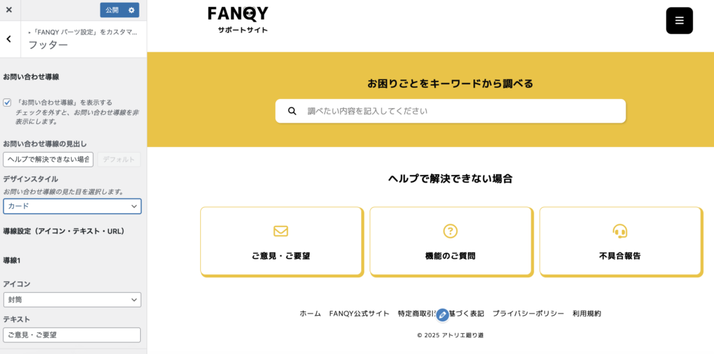 「外観」→「カスタマイズ」→「FANQYパーツ設定」→「フッター」に移動すると、問い合わせ導線の設定項目があります。