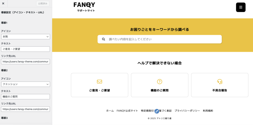 導線1〜導線3の設定項目を用意しており、それぞれ「アイコン」「テキスト」「リンク先URL」が設定できます。