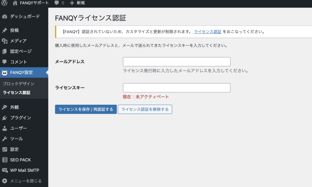 - 左メニューから「外観 > FANQYライセンス認証」をクリック